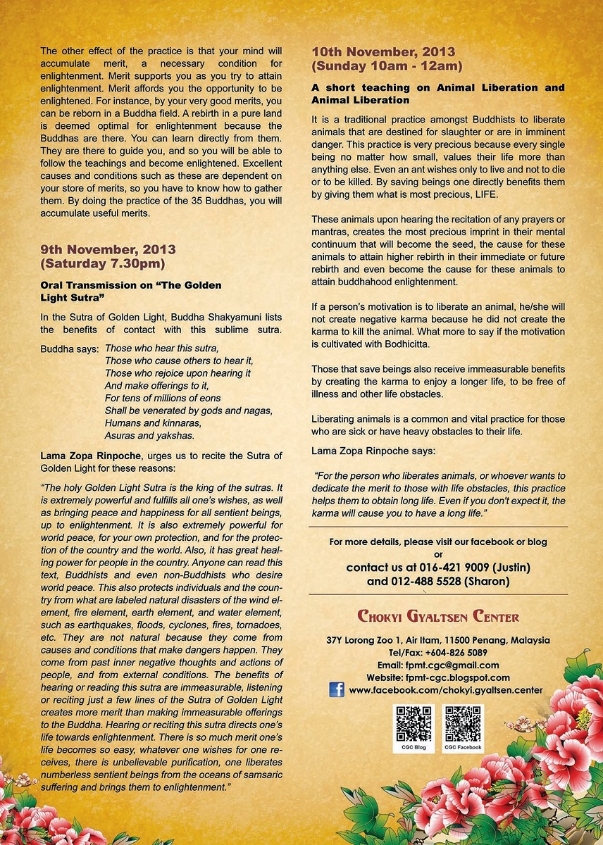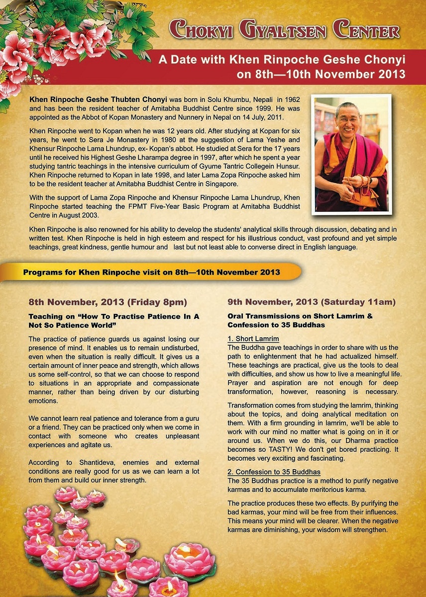 We are extremely delighted to announce that Khenrinpoche Geshe Chonyi, Abbot of Kopan Monastery, will be visiting CGC from 8th Nov (Fri) to 10th Nov (Sun) 2013.