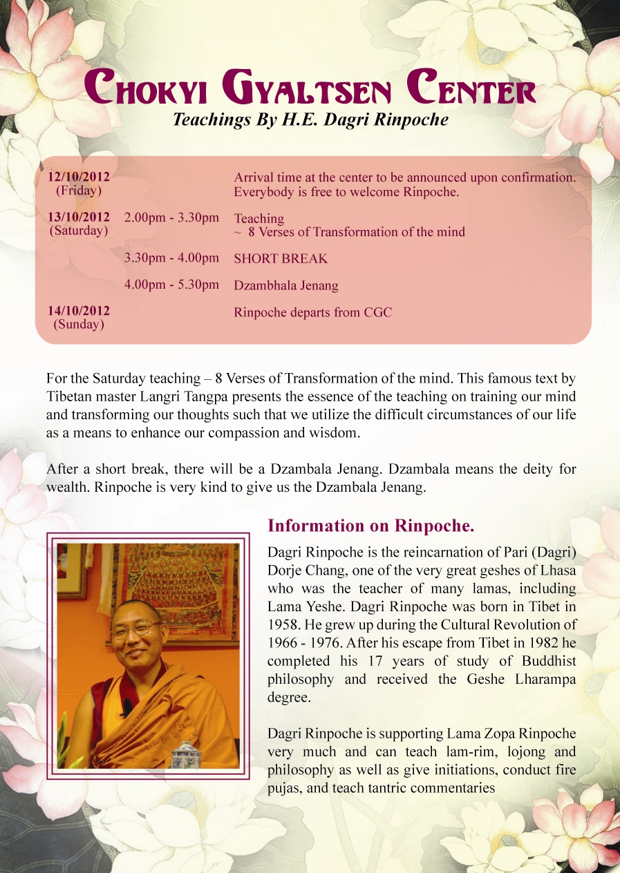 Please take note that H.E. Dagri Rinpoche has some urgent matters to attend to in India and is unable to come to Malaysia and hence his trip to CGC, Penang on Oct 12 - 14 has been postponed.
